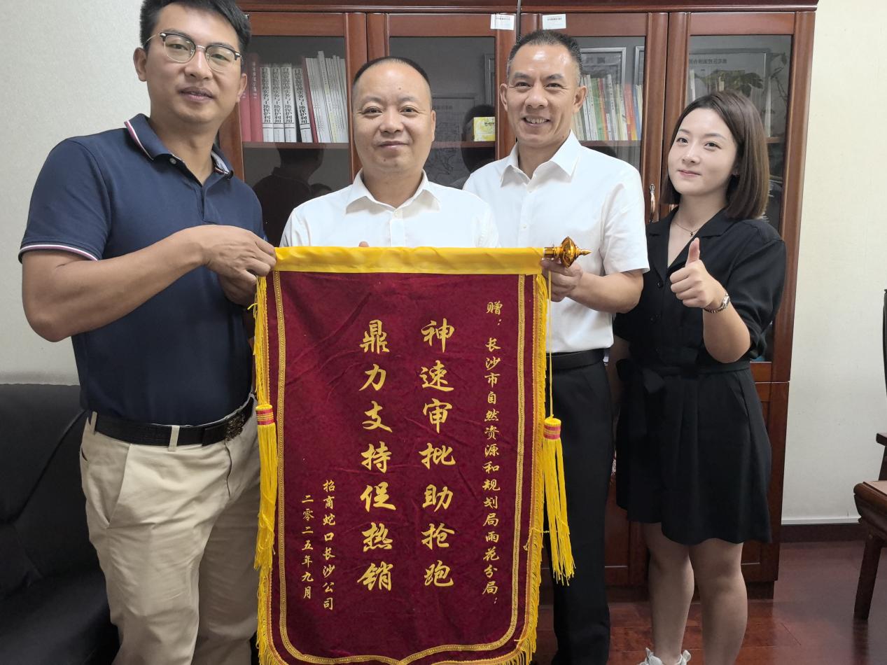 2025年9月8日,招商蛇口长沙公司代表专程来到长沙市自然资源和规划局雨花分局,送来一面写有“神速审批助抢跑,鼎力支持促热销”的锦旗,对分局在晨曦苑项目售楼部临时建设手续办理中提供的高效、专业服务表示衷心感谢。
