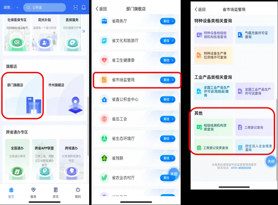 登录“湘易办”后,在首页“部门旗舰店”中选择“省市场监督管理局”,在“其他”栏目中点击对应服务名称即可进入;或在首页直接搜索相应服务名称进入。