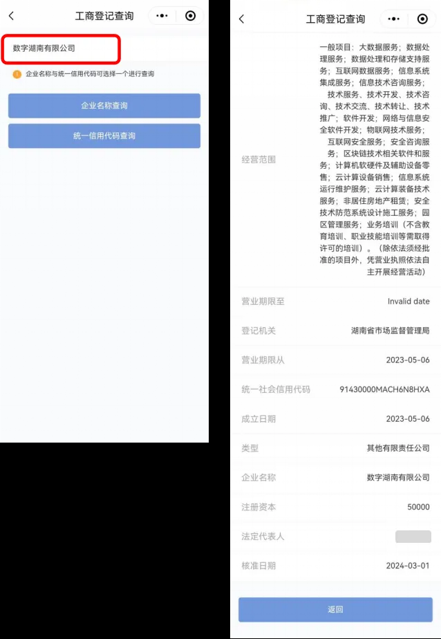 选择“工商登记查询”服务,输入企业名称或企业统一社会信用代码,即可查询企业与个体工商户的登记信息,包括企业经营范围、营业期限、成立时间、注册资本、法定代表人等。