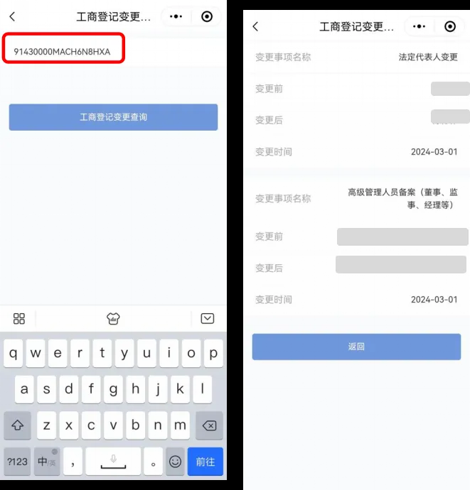 3.确认企业是否变更信息选择“工商登记变更”服务,输入企业统一社会信用代码,即可查询到企业的变更信息。包括变更事项名称、变更时间以及变更前后的信息。