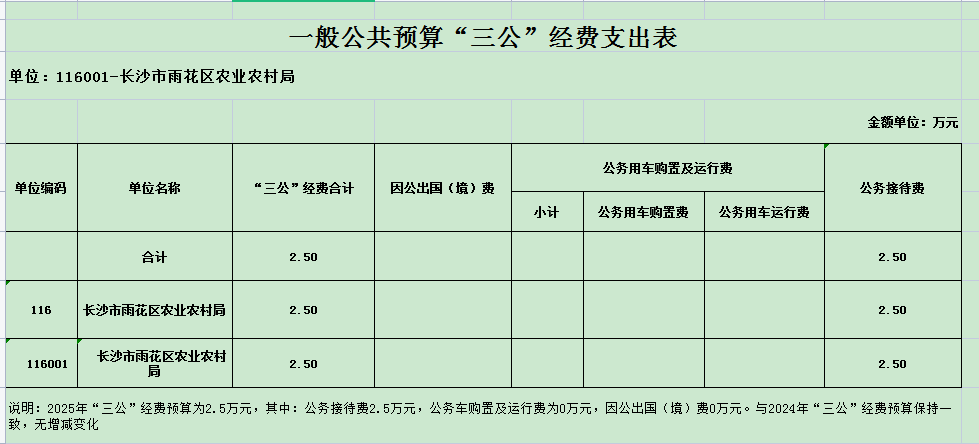 长沙市雨花区农业农村局2025年度一般公共预算“三公”经费支出表