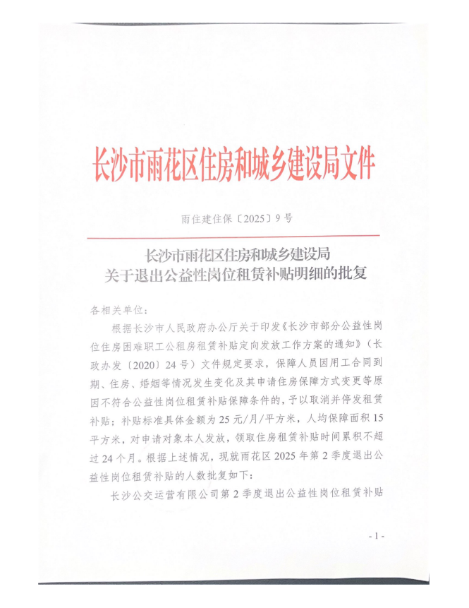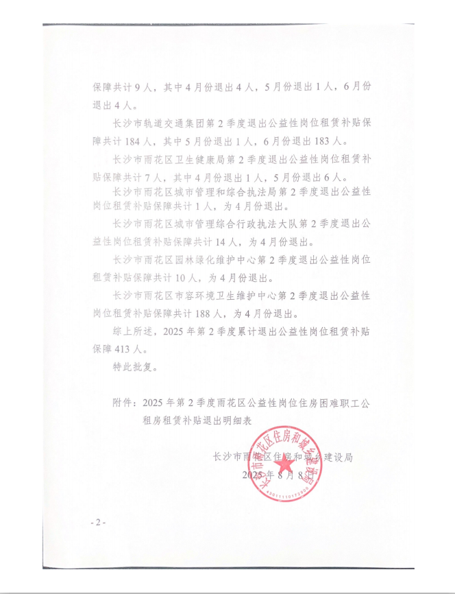 长沙市雨花区住房和城乡建设局关于退出公益性岗位租赁补贴明细的批复