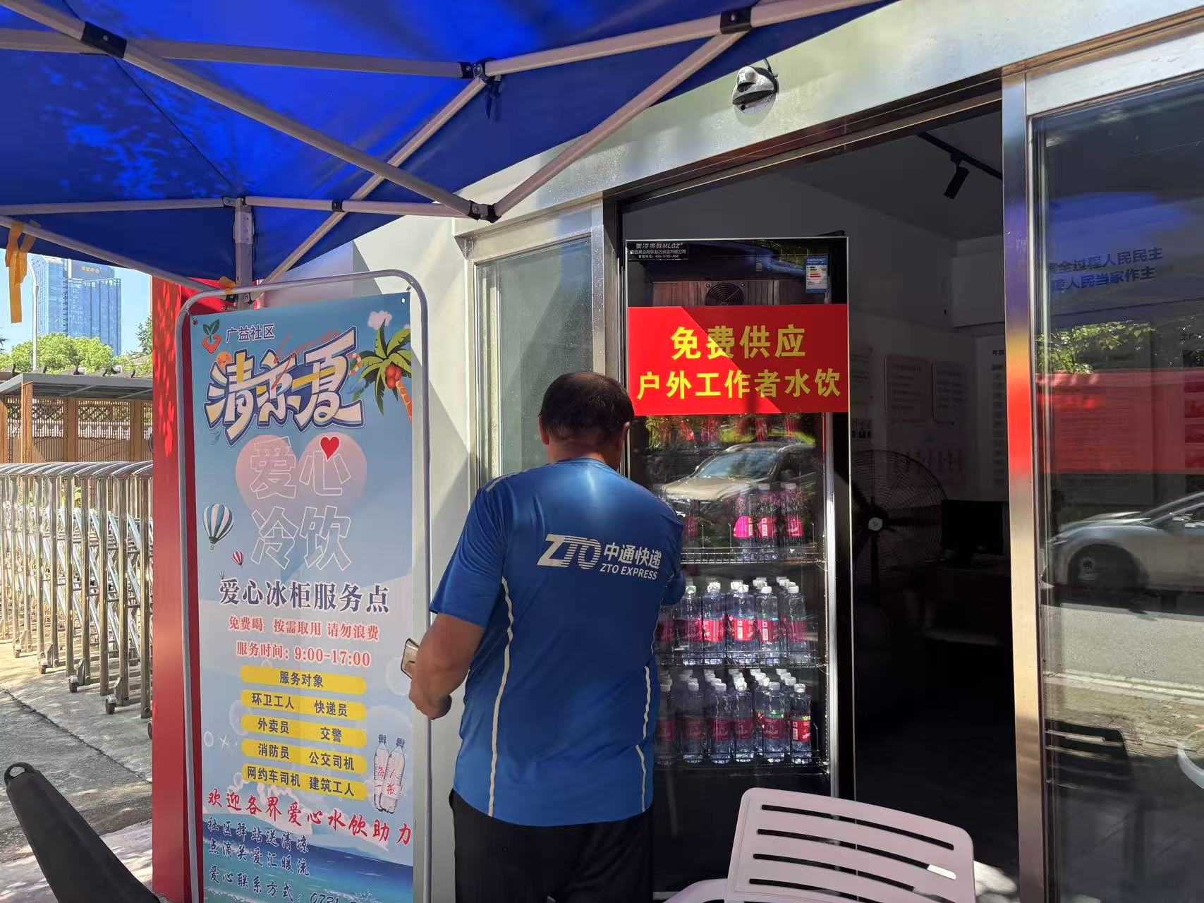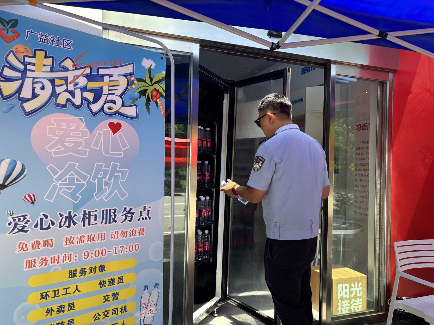 “以前夏天带的水经常不够喝,现在有了这个水站,随时都能喝到冰水,真是太方便了!”正在取水的环卫工人李师傅高兴地说。据了解,该水站主要服务对象包括:烈日下工作的环卫工人、高温下奔波的外卖、快递从业人员、户外执勤的交警、城管队员、建筑工地工人等高温作业人群等,广益社区书记介绍,在走访调研中发现,这些户外劳动者普遍存在饮水供给不足问题,于是萌生了设立免费饮水点的想法。