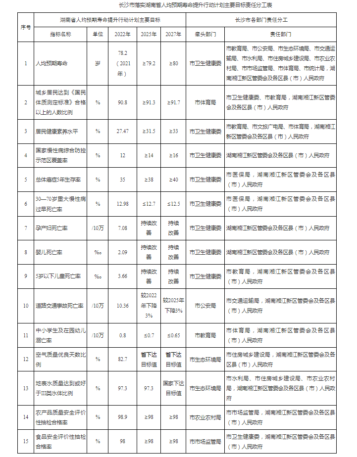 附件:长沙市落实湖南省人均预期寿命提升行动计划主要目标责任分工表